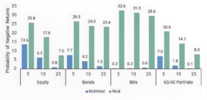 Probability of Negative Total Returns (nominal and real) over 5, 10 and 25 year Horizons across all sample economies and periods using 200 years plus of data across 56 countries